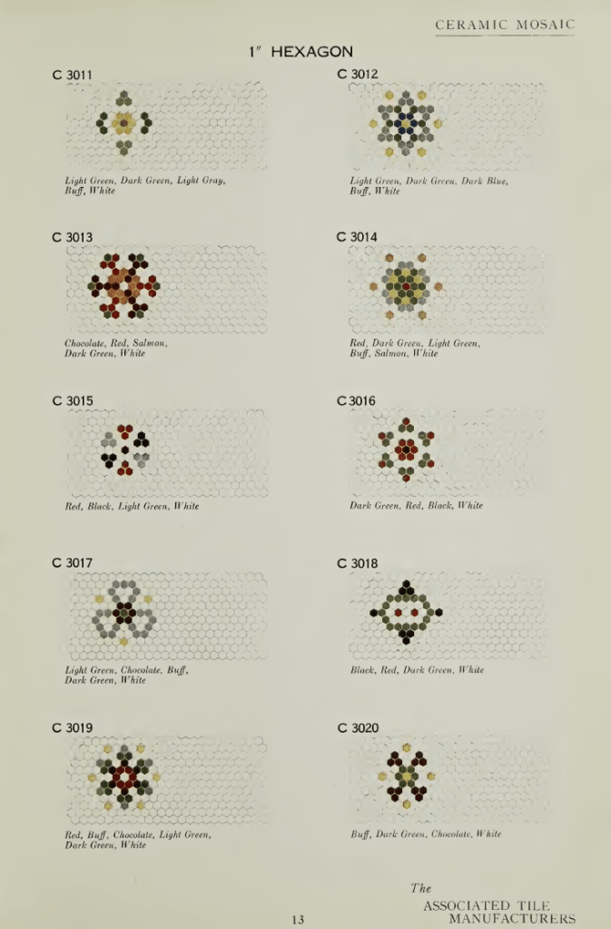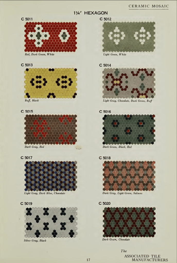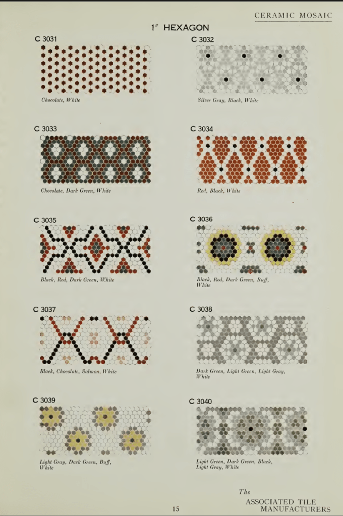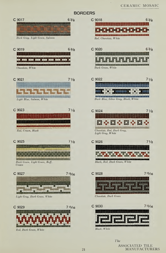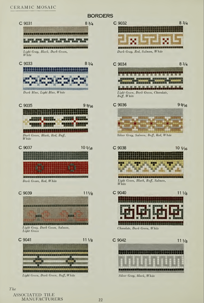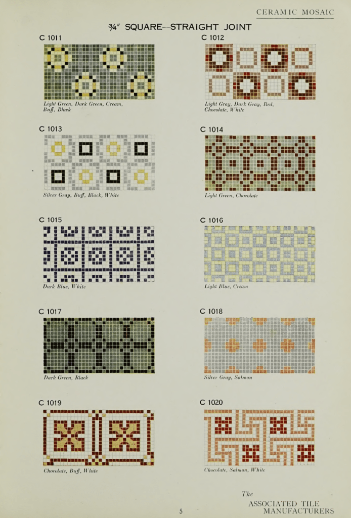 The Associated Tile Manufacturers avea sediul în Graybar Building, Lexington Avenue, New York, și publica frecvent broșuri despre beneficiile estetice și igienice ale plăcilor ceramice, dar și cataloage cu principalele modele standardizate utilizate în perioada interbelică. Răsfoind un catalog intitulat Ceramic Mosaic. Standardized Sheets and Patterns din 1922, am regăsit cu bucurie câteva dintre modelele care erau în vogă atât dincoace, cât și dincolo de Oceanul Atlantic, inclusiv în capitala României. Mai jos, regăsiți câteva pagini din acest catalog, precum și o serie de paralele între unele modele și pardoselile bucureștene (culorile diferă), existente în imobilele Art Deco pe care le-am fotografiat.